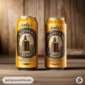 Two Andy's beer cans with intricate brown and gold labels on wood.