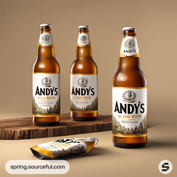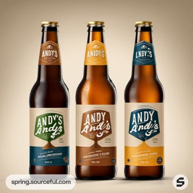Three Andy's beer bottles with various label designs on a beige background.