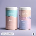 Two tins in pastel colors with geometric background elements.