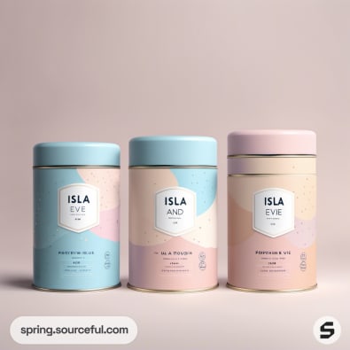 Five minimalistic pastel tins arranged on staggered platforms.