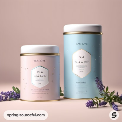Two tins with lavender accents and foliage in the background.