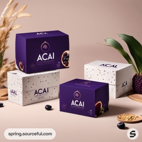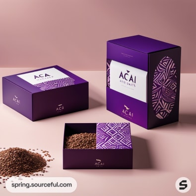 Purple and white acai packaging featuring intricate patterns and grains.