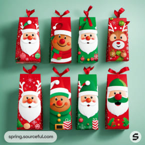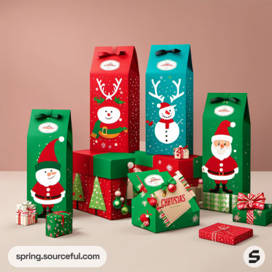 Tall boxes with Santa, reindeer, and snowman designs with bows.