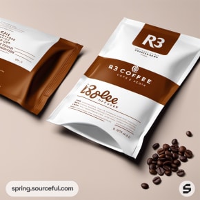Brown and white coffee sachets with beans scattered.