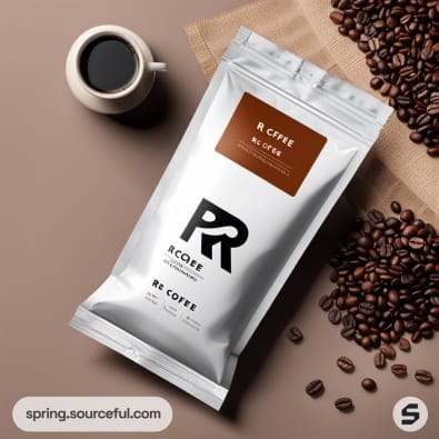 Silver vacuum-sealed coffee bag with brown label and coffee cup.
