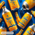 Assorted orange beer bottles and cans on blue surface