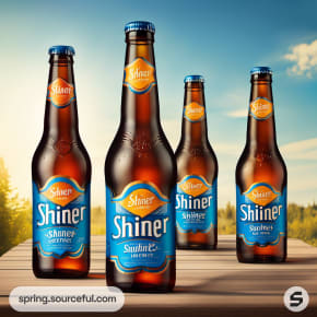 Four beer bottles on a wooden surface with blue skies