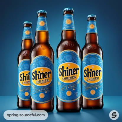Four beer bottles with blue and yellow labels