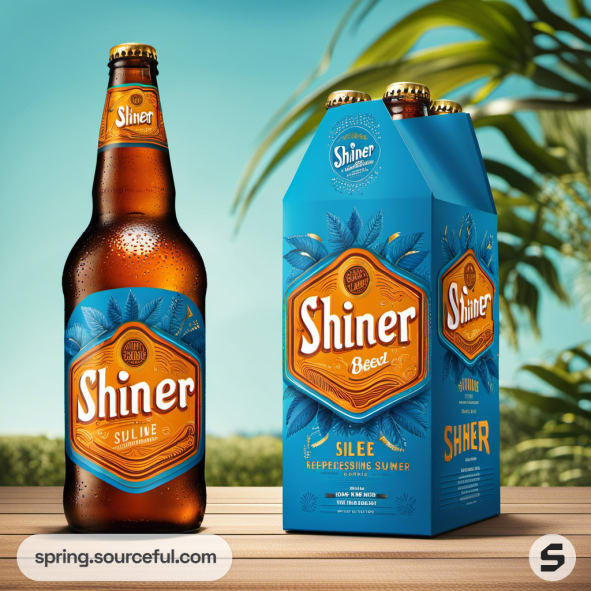 Beer bottle with blue label beside matching four-pack carrier