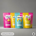 Four resealable pouches in pink, yellow, and blue with fruit illustrations.