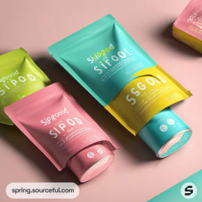 Five pouches in green, pink, yellow, and blue, with white caps, on a neutral backdrop.