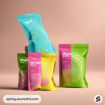 Six colorful resealable pouches and one small sachet on a gray surface.