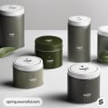 Green tins with lids, one open showing product.