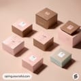 Colorful boxes in green, brown, and pink with decorative spheres.