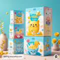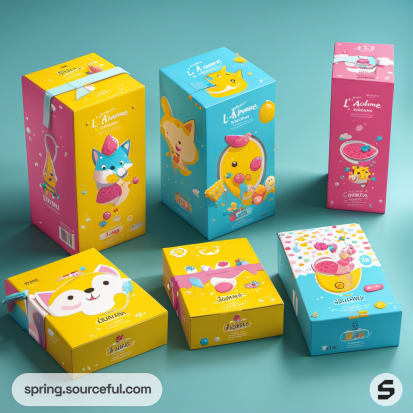 Assorted vertical boxes with colorful cartoon patterns on teal background.