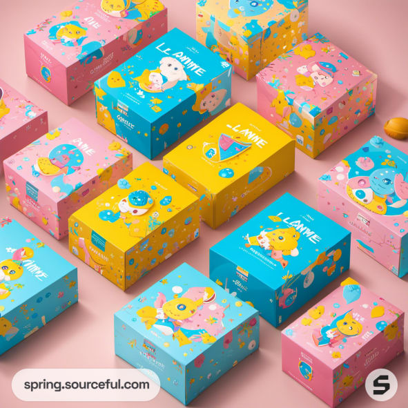 Assorted pink and yellow illustrated boxes with blue backdrop.