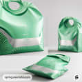 Green sculpted resealable pouch with silver accents, featuring a geometric design and handle.