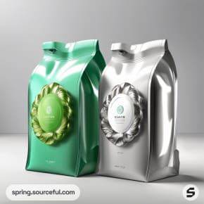 Two resealable pouches, one green and one silver, with decorative round seals on the front against a gray background.