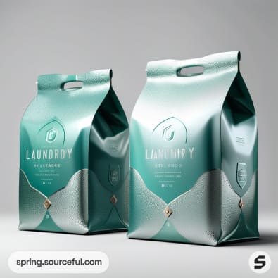 Two teal-green resealable pouches with laundry detergent design on a gray background.