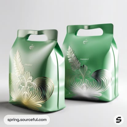 Green resealable bags with floral design and handle, featuring gold and white accents.