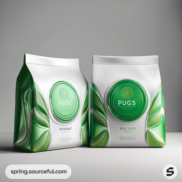 Two green and white resealable pouches with leaf designs, displayed against a gray background.