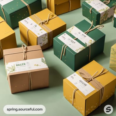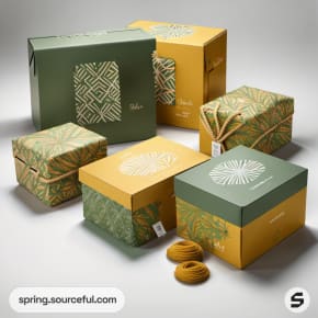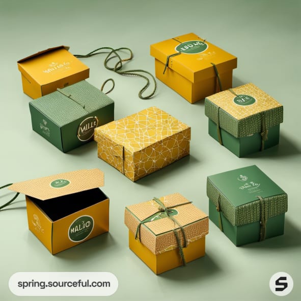 Green and yellow patterned boxes with twine ties on a gray backdrop.