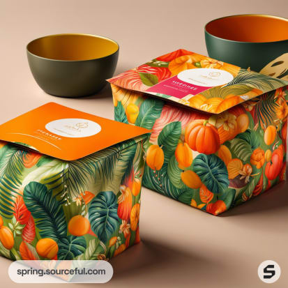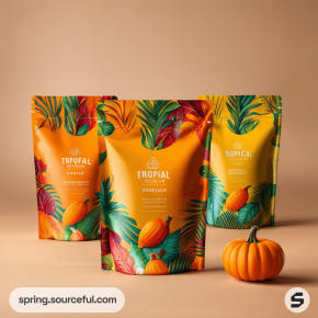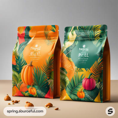 Tropical design resealable pouches with vibrant orange and green patterns, surrounded by decorative pumpkins.