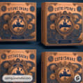 Two ornate blue and bronze beverage boxes with gear and clock designs on a blue background.