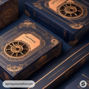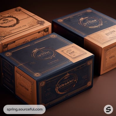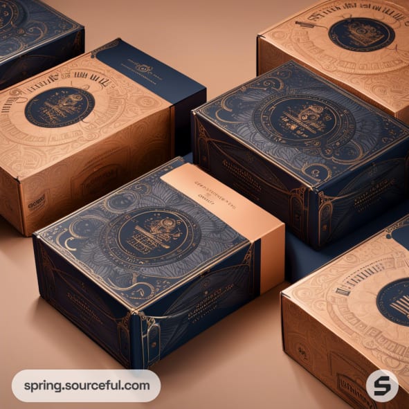 Elegant cardboard boxes with intricate gold and navy designs on a beige background.