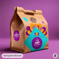 Colorful brown carton with vibrant patterns and a handle against a purple backdrop.