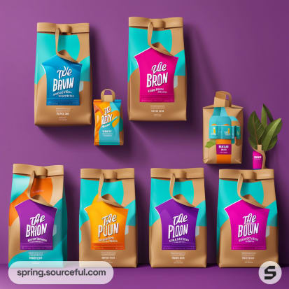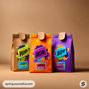 Colorful paper product pouches with abstract designs against vibrant backgrounds.