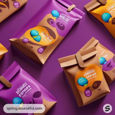 Colorful snack packaging with brown and purple resealable pouches on a purple background.