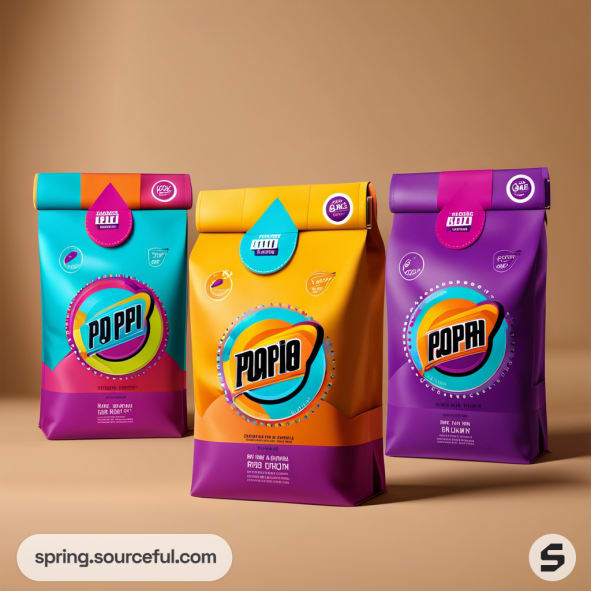 Three vibrant laundry detergent pouches in brown, orange, and purple with colorful splash designs.