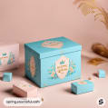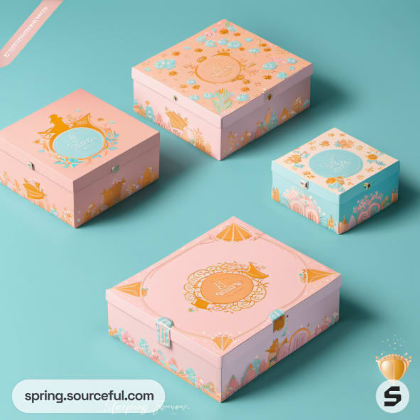 Four decorative pastel boxes with floral and crown designs on a blue background.