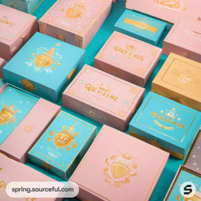 Assortment of pastel boxes with crown and floral motifs on a blue background.
