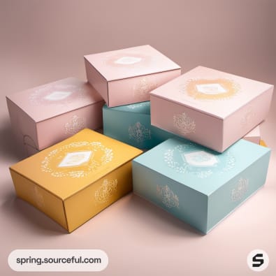 Various pastel boxes with floral designs on a beige surface.