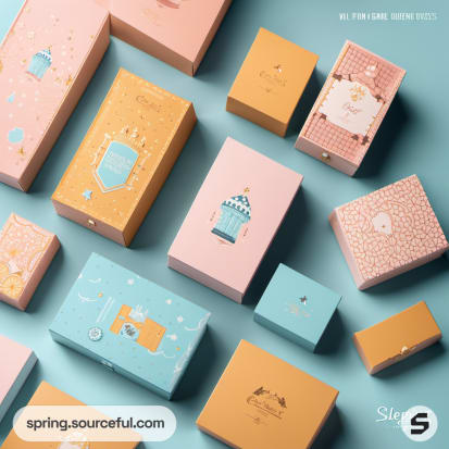 Collection of pastel rectangular boxes with whimsical illustrations on a blue surface.