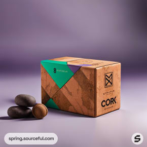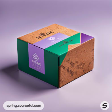 Eco-friendly mailer box with cork texture, green and purple accents, and geometric design on a subtle purple background.