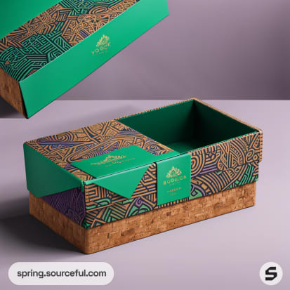 Rectangular cardboard box with geometric patterns and green accents, two small cork cubes beside it.