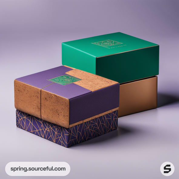 Stacked elegant gift boxes with geometric patterns, one purple with cork texture, the other green, on a soft gradient background.