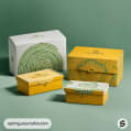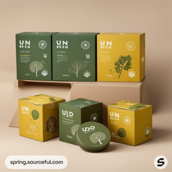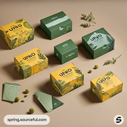 Assorted eco-friendly boxes with green and yellow leaf patterns on a yellow background.
