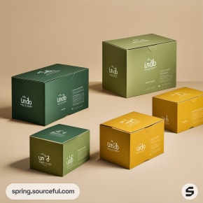 Green and yellow eco-themed boxes with leaf designs on a neutral surface.