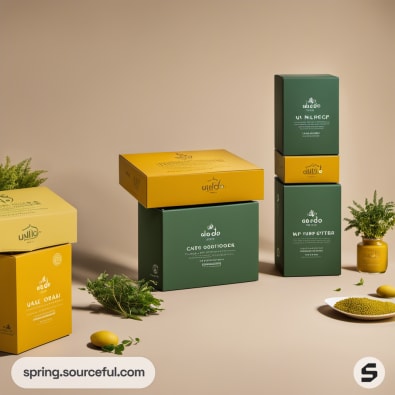 Stacked green and yellow boxes with herbs and plants on a beige background.
