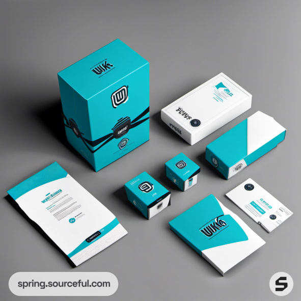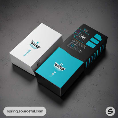Tall turquoise cylindrical and box packaging with wave pattern.
