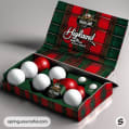 Open tartan gift box with multiple red and white golf balls.