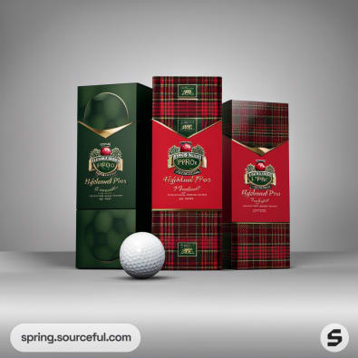 Three tall boxes with tartan and green design, featuring golf branding.