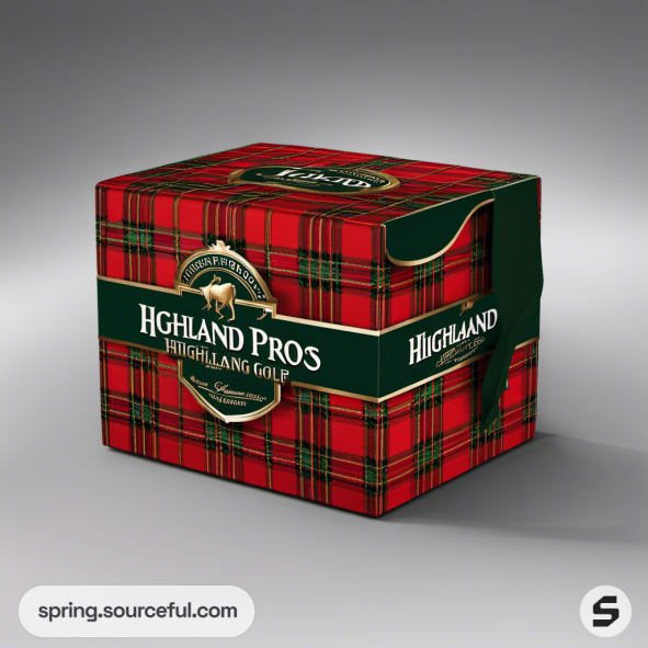 Tartan-patterned mailer box with deer logo and golf-themed branding.