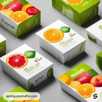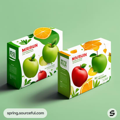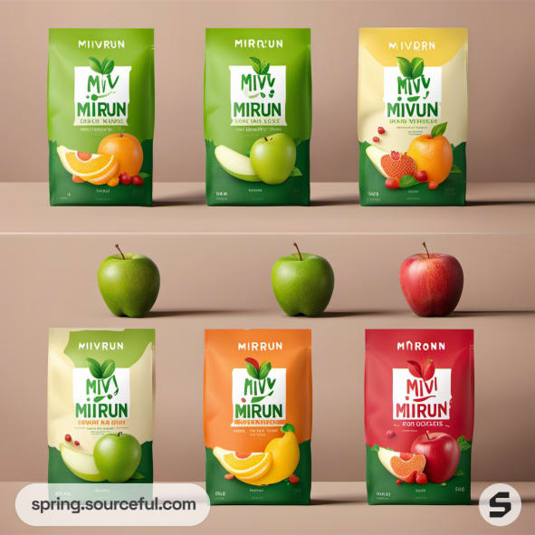 Colorful fruit packaging with apples and citrus on resealable pouches.
