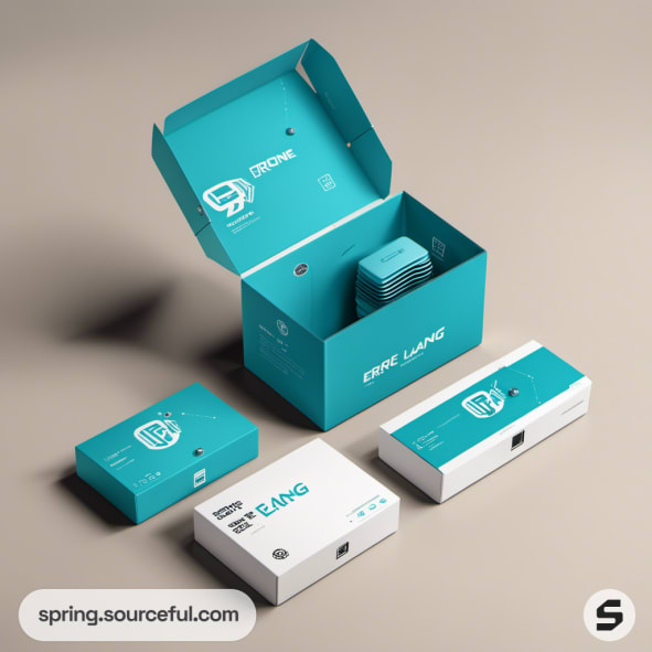 Various teal and white drone packages on beige background.