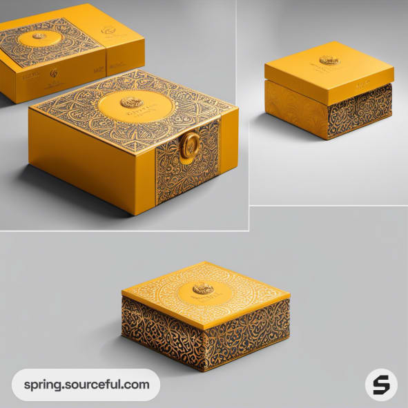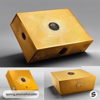 Decorative gold gift box with artistic detailing.